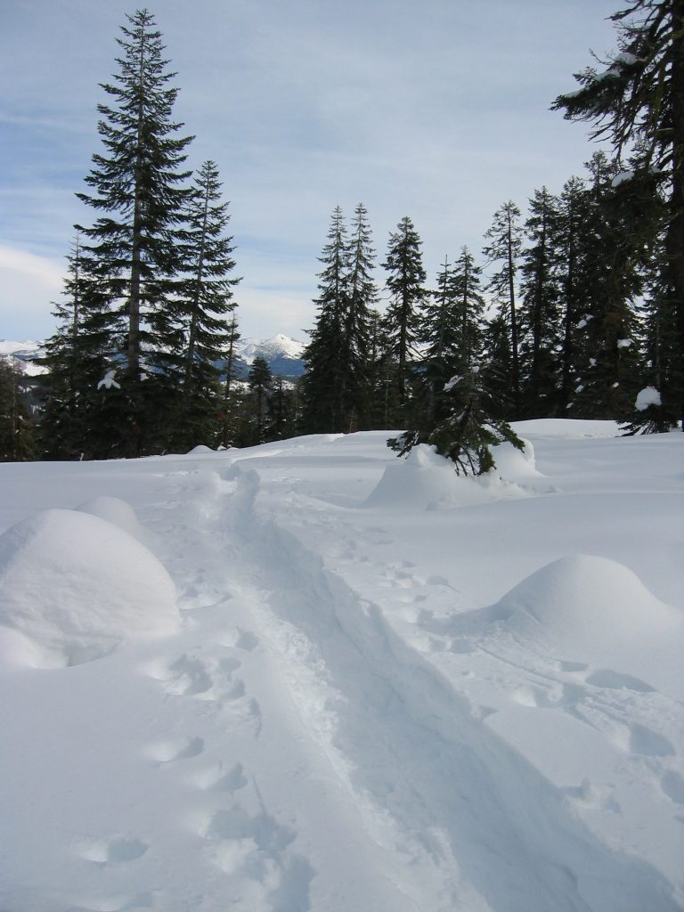 We had a little hotel room in Mariposa, just outside Yosemite Valley. We’d gone grocery shopping, and were day-tripping into the valley on the first bus of each day; the one the valley’s employees use each morning, so we were arriving before things were open. One morning we rented our own snow shoes, and packed a full lunch—hot soup and all. We bused up to Badger Pass ski area and took their guided snow shoe walking tour to the top of the pass. Eventually, everyone else turned around and walked back. We stomped some seats and a table into the deep snow, sat on our jackets in the glorious sun, and spent an hour having our lunch with this view.